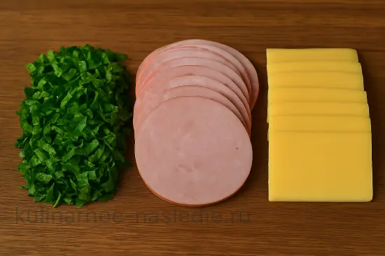 Пока капуста тушится, подготовьте остальные ингредиенты. Мелко нарежьте щавель. Ветчину нарежьте тонкими ломтиками, а твердый сыр тоже тонкими ломтиками или натрите на крупной терке, как вам больше нравится.