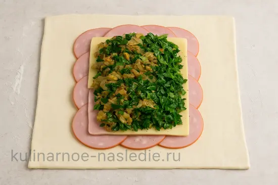 Теперь займемся тестом. Раскатайте слоеное тесто в прямоугольник толщиной примерно 5-7 мм. Постарайтесь сделать его достаточно большим, чтобы хватило на начинку. На середину раскатанного теста выложите ломтики ветчины в один слой. Сверху на ветчину положите ломтики сыра, а затем снова слой ветчины. После этого равномерно распределите тушеную капусту и нарезанный щавель. Поперчите начинку по вкусу.
