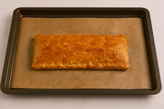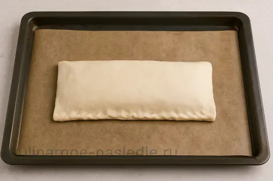 Соедините длинные края теста над начинкой и плотно защипните их, чтобы получился шов. Точно так же скрепите короткие стороны пирога, чтобы начинка не вытекла. Переверните пирог швом вниз и выложите его на противень, заранее смазанный маслом или застеленный пергаментной бумагой. Это поможет пирогу не прилипнуть и равномерно пропечься.