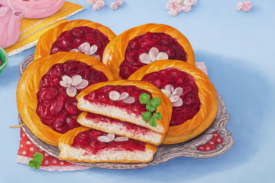 Главное украшение этих булочек не только сочная, загущенная крахмалом вишнёвая начинка, которая гарантированно не вытечет при выпечке, но и оригинальная подача. Вместо обычных пирожков здесь из дрожжевого теста формируют открытые «корзиночки» с бортиками из тестяных жгутиков. Такая форма не только выглядит эффектно, но и отлично удерживает начинку внутри, позволяя ей слегка карамелизироваться по краям. А хрустящие миндальные лепестки, которыми щедро посыпаны булочки сверху, добавляют приятный ореховый акцент и делают выпечку ещё ароматнее. Эти сдобные булочки с вишней и миндалем станут настоящим хитом домашнего чаепития.