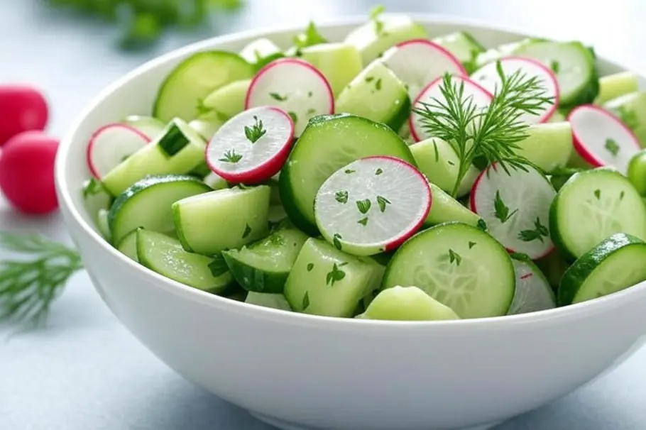 Невероятно свежий и хрустящий салат из молодых огурцов, редиса и ароматной зелени. Идеальный выбор для здорового перекуса или легкого гарнира. Быстрое приготовление, минимум калорий и максимум пользы!